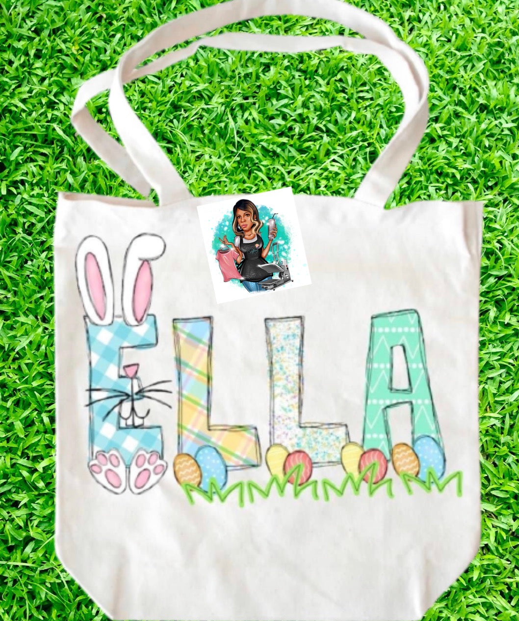 Customized Easter Bag for the little one. Bags are sized at 13.5 x 13.5 x 4 in. Color appear as a beached/off white color. Based on the name, the letter selction will vary.