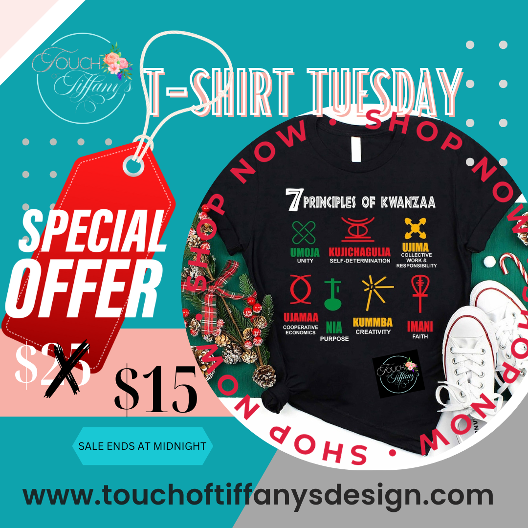 👕 Celebrate the spirit of Kwanzaa with our special T-shirt featuring the seven principles of the holiday! 🕯️ Embrace unity, self-determination, collective work, responsibility, cooperative economics, purpose, and creativity. 🎨✨ Wear the values that make Kwanzaa special and share the joy of this cultural celebration. Available now! #KwanzaaTee #SevenPrinciples #CulturalCelebration #UnityInDiversity