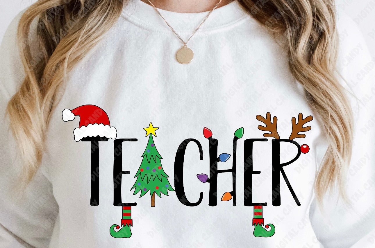 Check out this festive Teacher Christmas Shirt—the perfect way to celebrate the season and show your love for teaching! Available exclusively in white, this design is filled with holiday spirit, featuring fun seasonal elements like Santa hats, Christmas trees, reindeer antlers, and elf shoes.