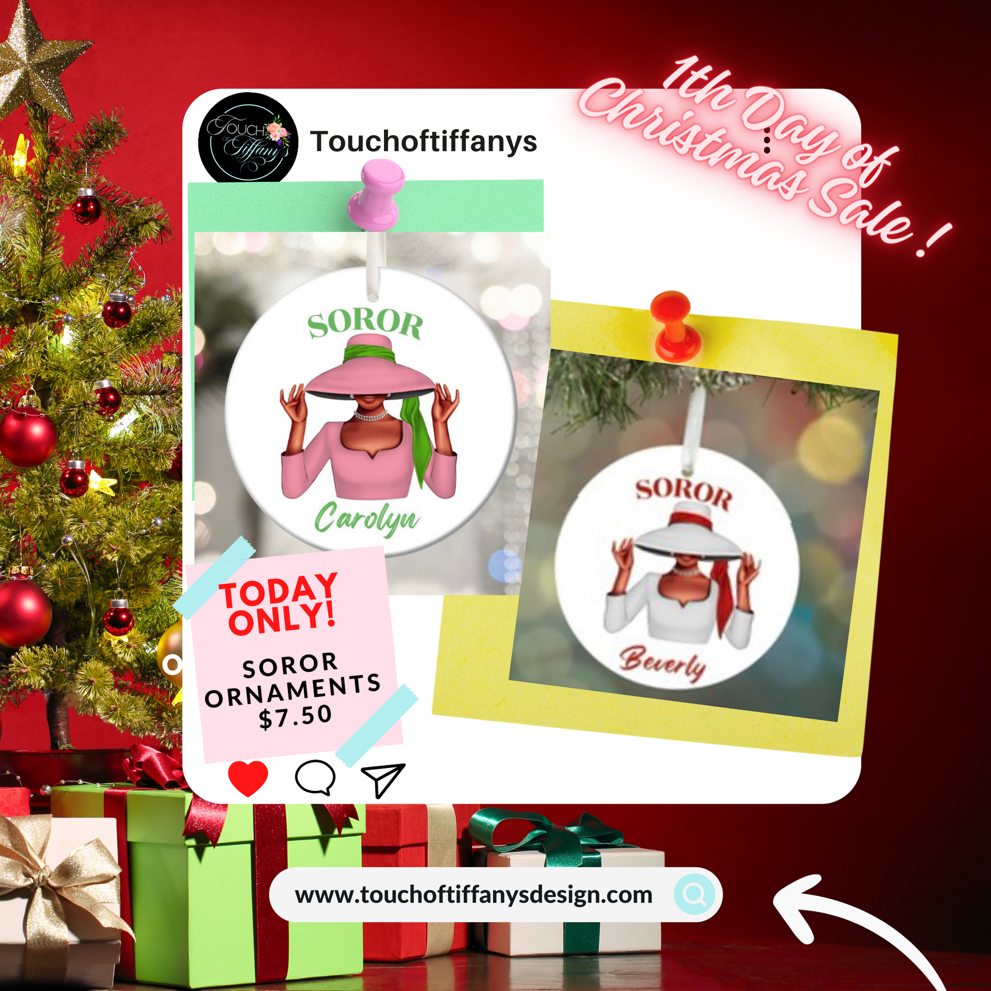 Shop our 11th Day of Christmas Sale. Custom Ornaments. 3 inch round customized with Soror Name. Available in Red and Pink only.
